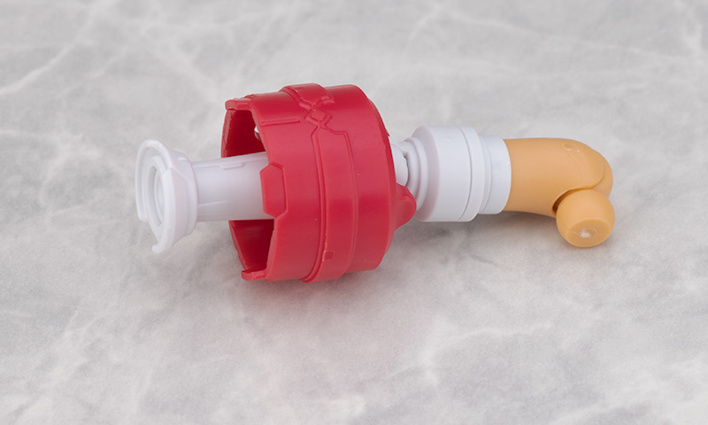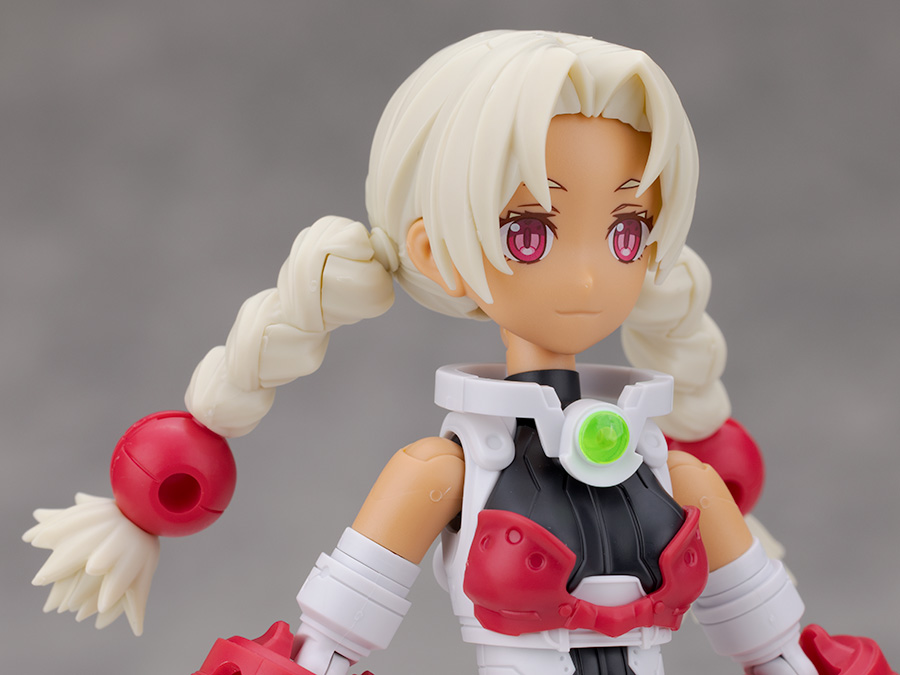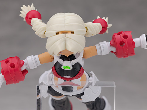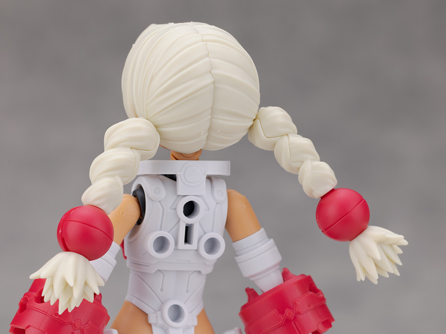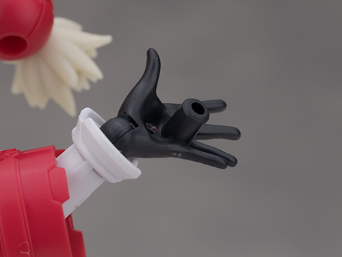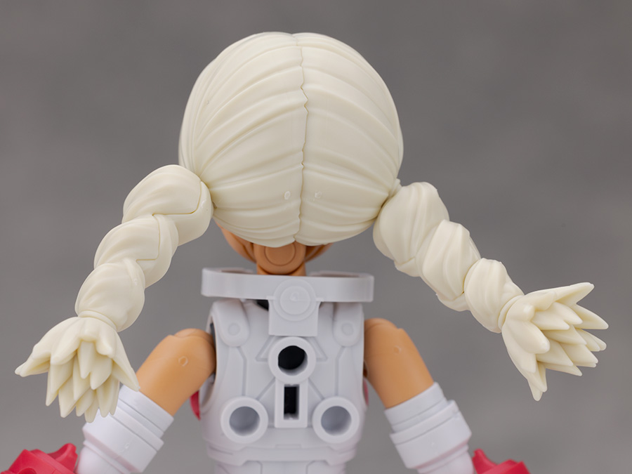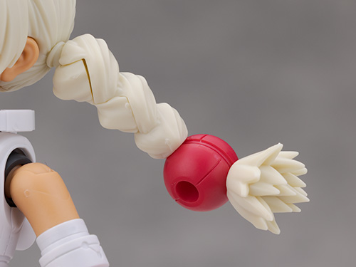 おさげの飾り無しにするには赤いパーツを取り外し、付属の交換用ジョイントを取り付けて再現します。