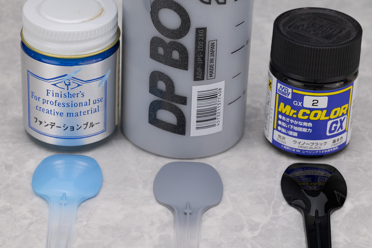 早速それぞれのカラーを試していきますが、今回は青系のファンデーションブルー、1200番程度のサフ、クレオスのウイノーブラックを吹き付けたスプーンを用意しました。