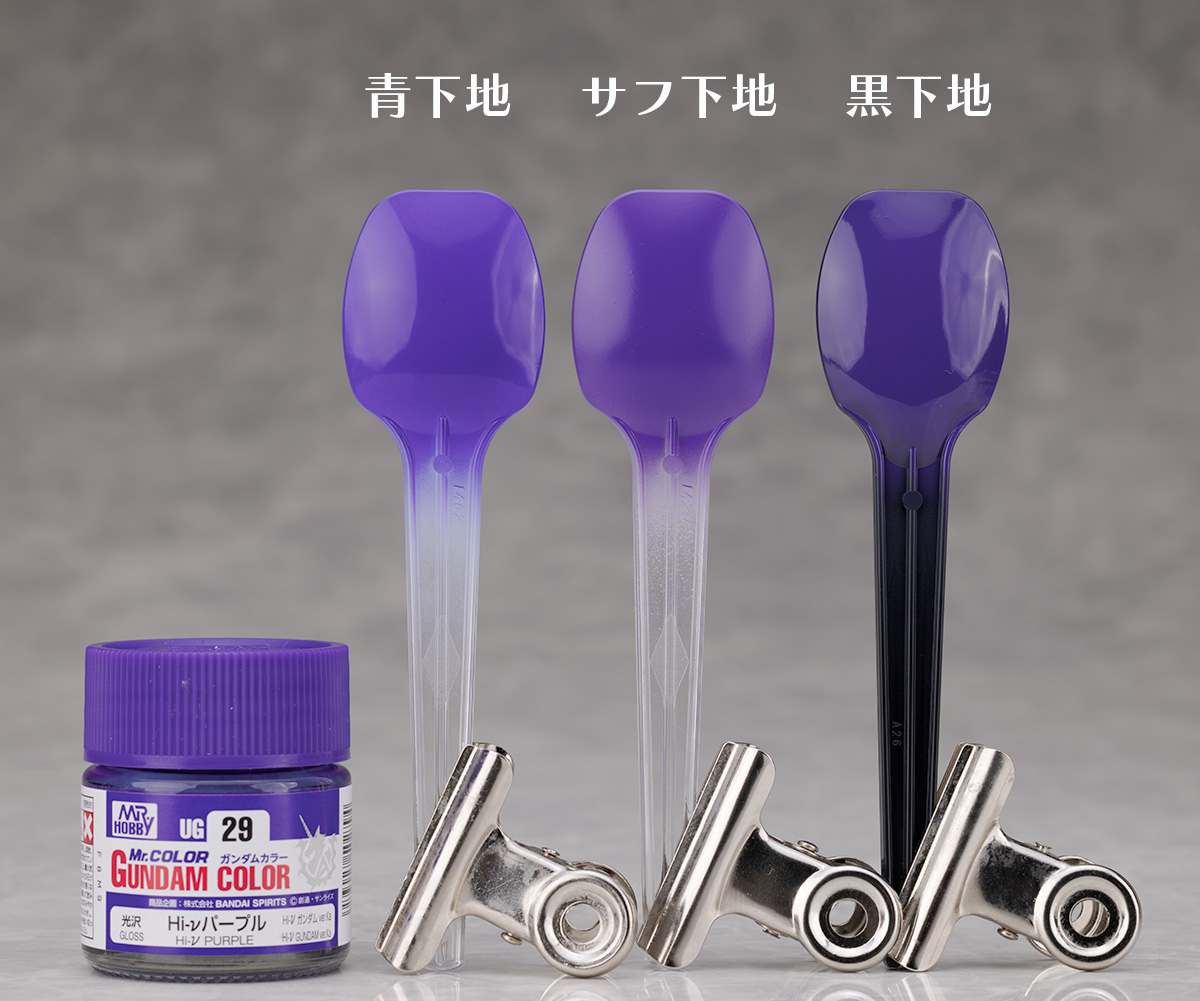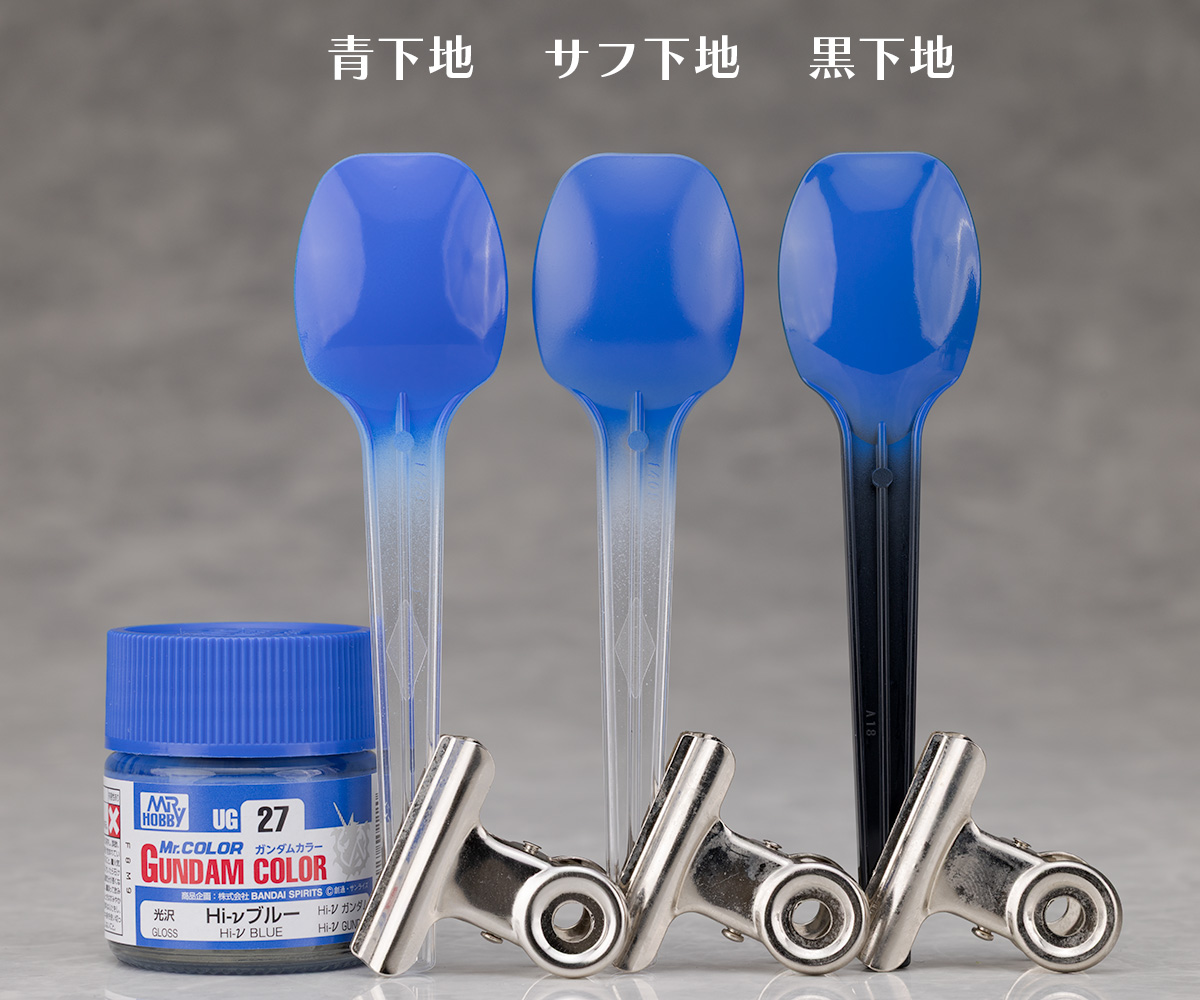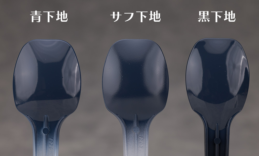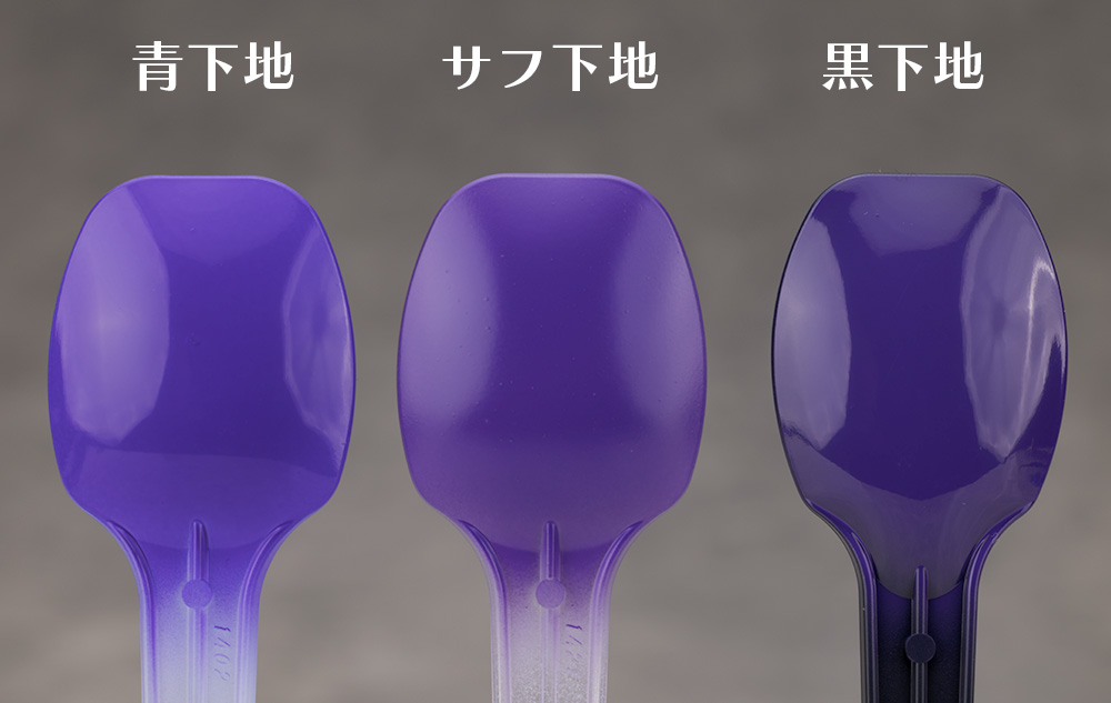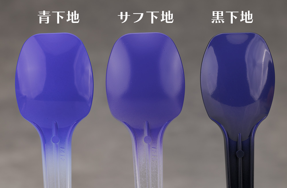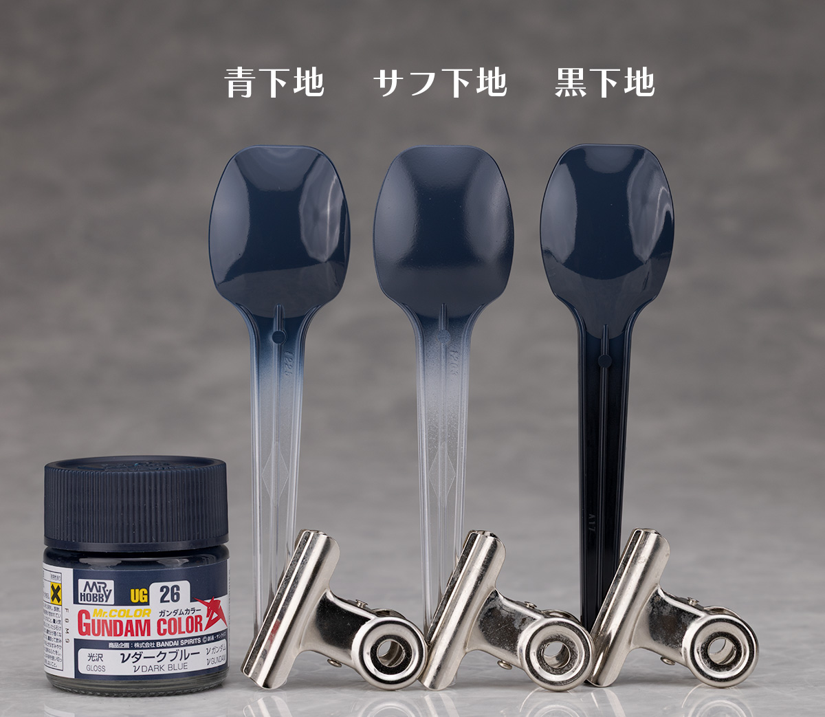 それぞれのスプーンに吹き付けてみるとダークブルーやブルーより下地に影響される感じでサフ地でも若干暗くなる印象。