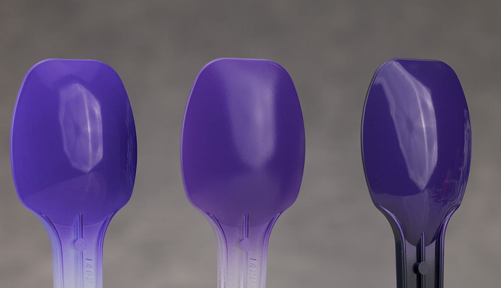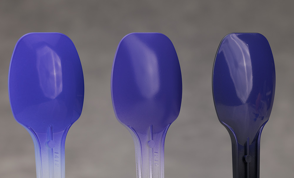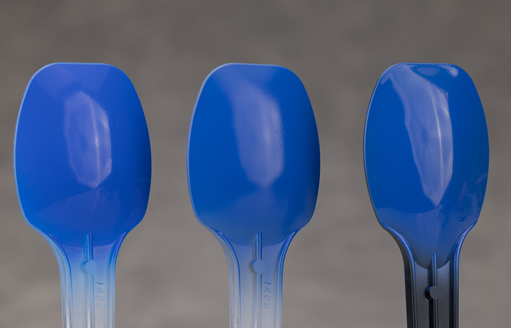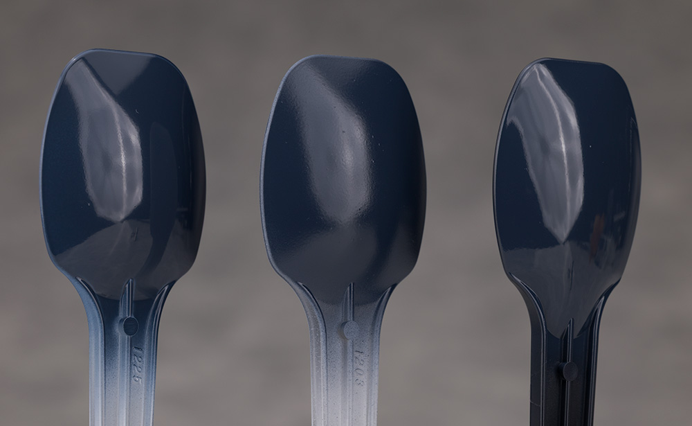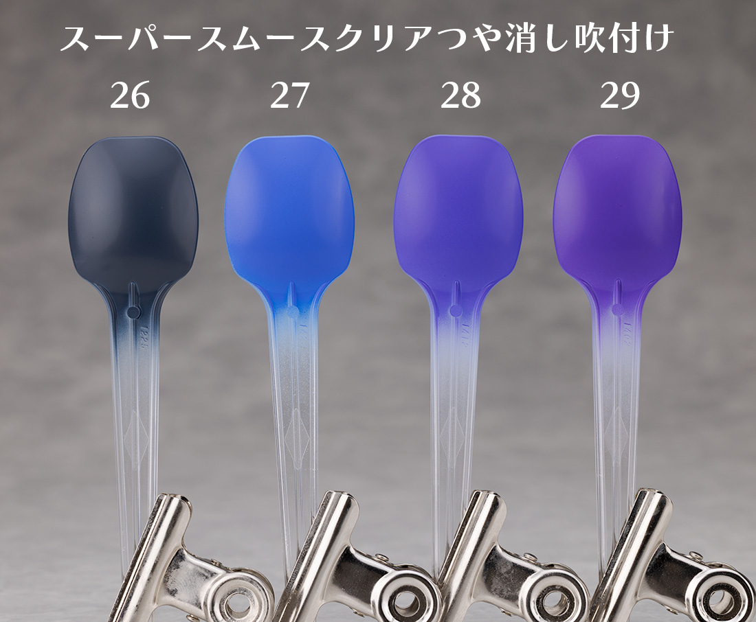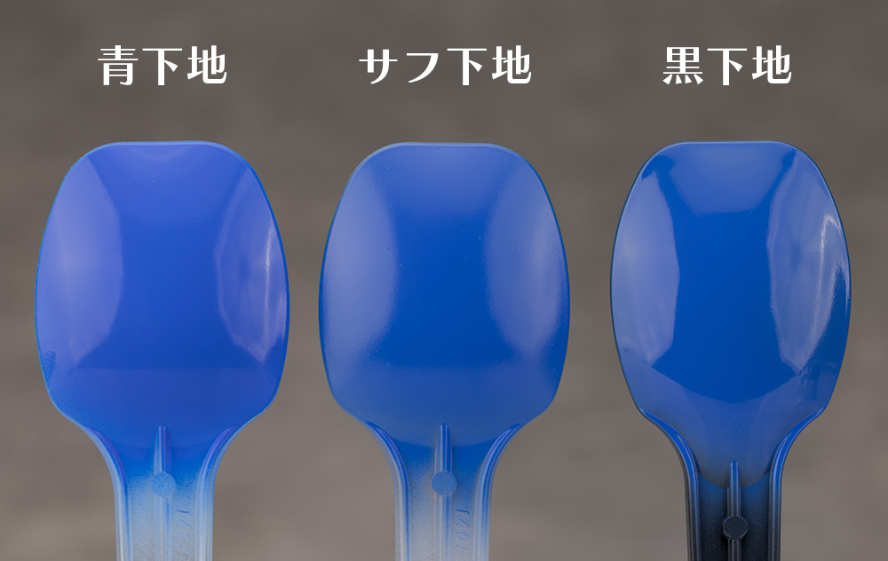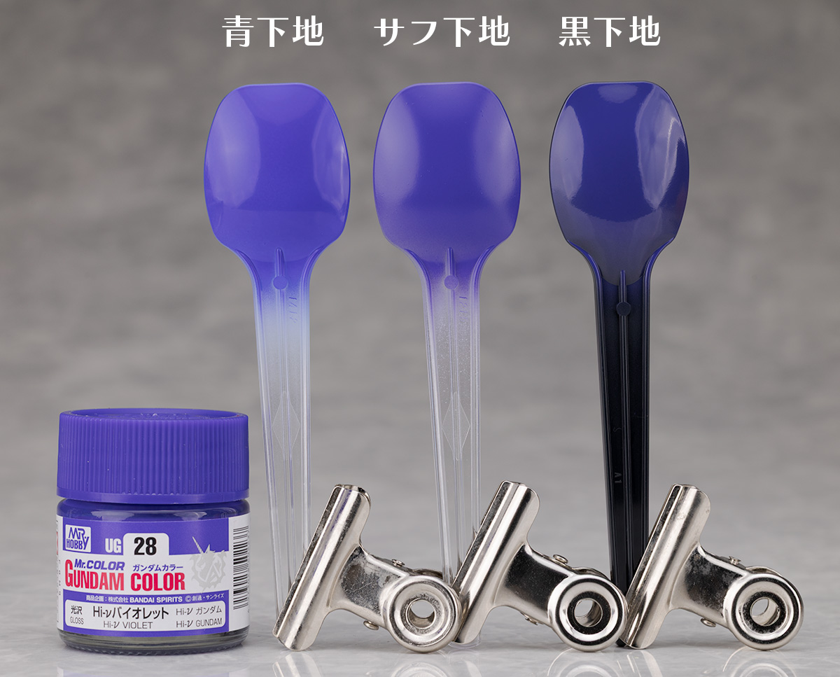それぞれのスプーンに吹き付けてみるとダークブルーやブルーより下地に影響される感じでサフ地でも若干暗くなる印象。