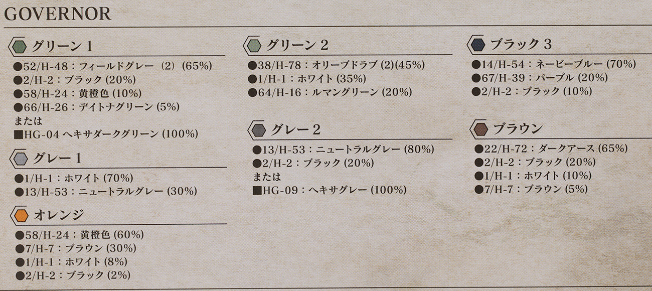 ガバナーの大まかな配色は成型色で再現はされていますが、本来グリーン部分はグリーンとライトグリーンが使われているため細かい塗り分けが必要です。
