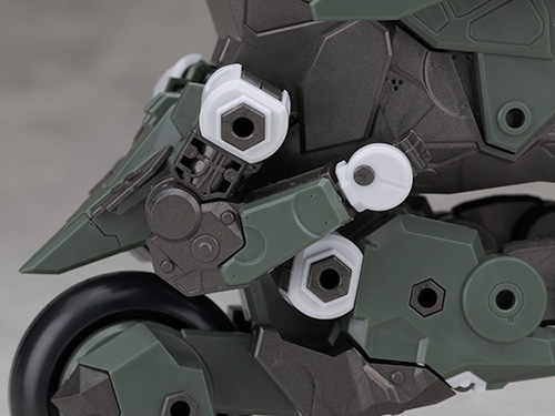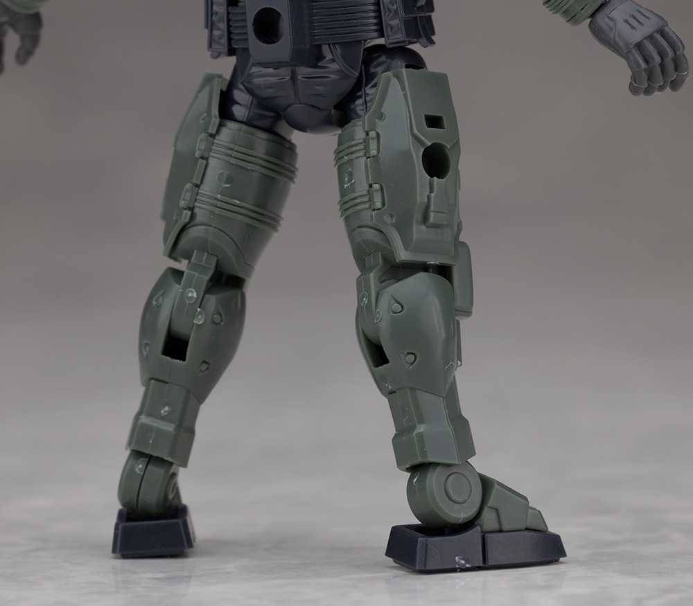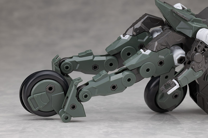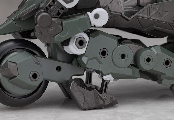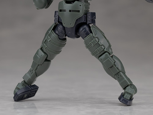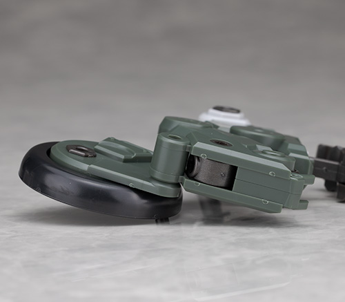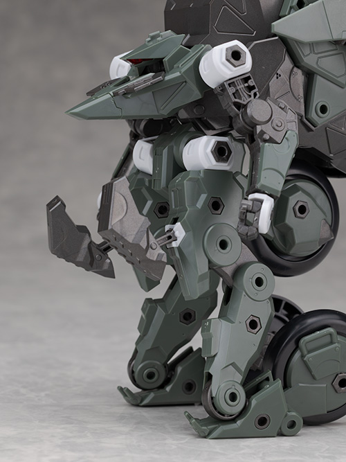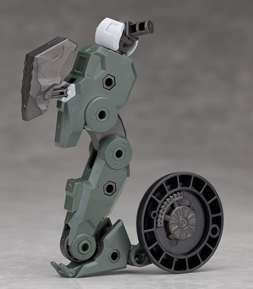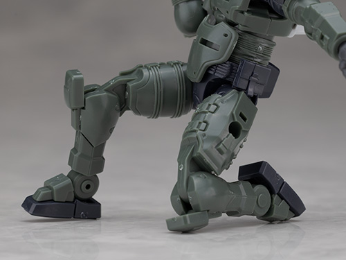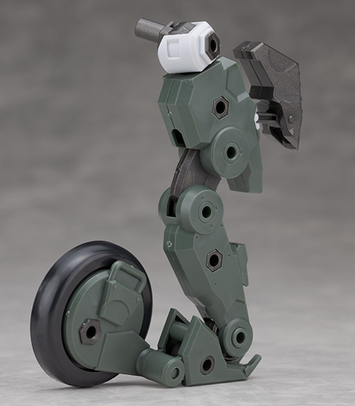 脚部は独特のデザインで関節などの他、飛び出たような膝アーマーや半分になったタイヤで構成されているカカト部分が面白いです。