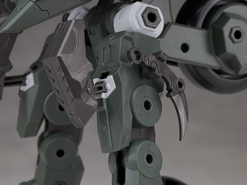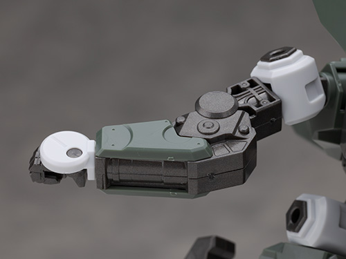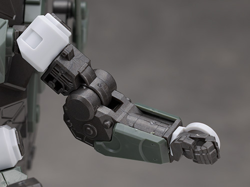 腕部は上腕などのフレームが剥き出しで装甲は少なめのデザインで低コスト化されたという設定らしい作りです。