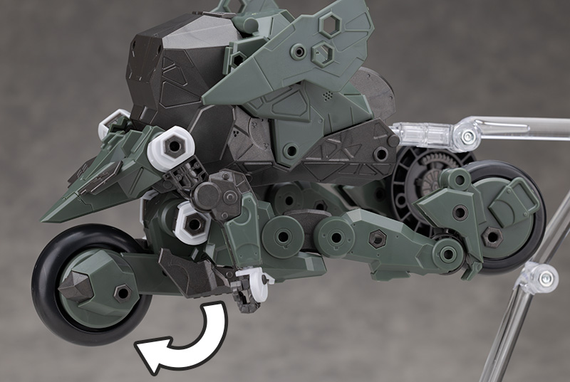 3mm軸のスタンドも問題なく使えますし、タイヤを展開すれば変わった姿勢で飾る事もできます。