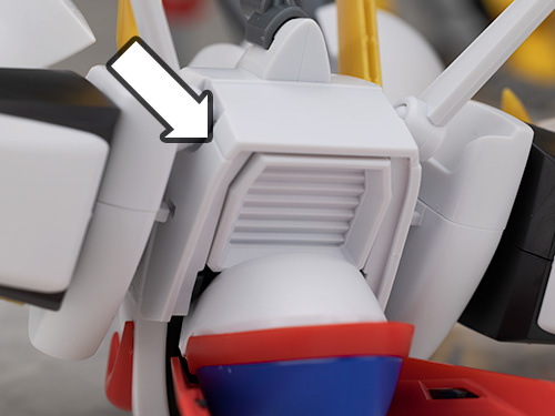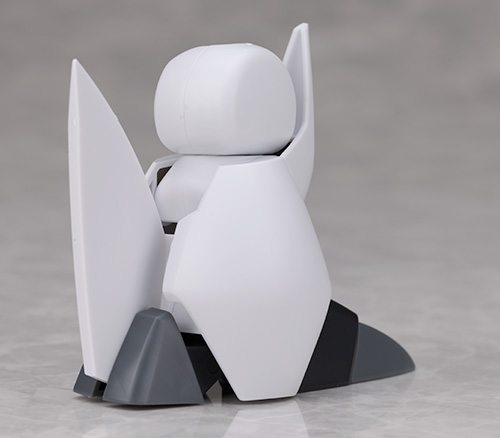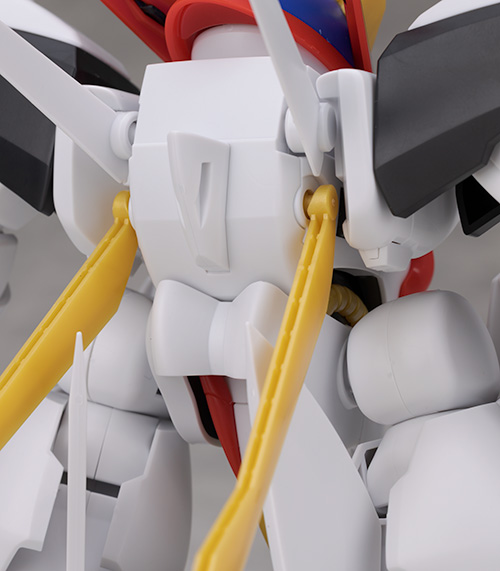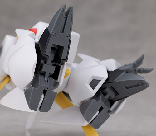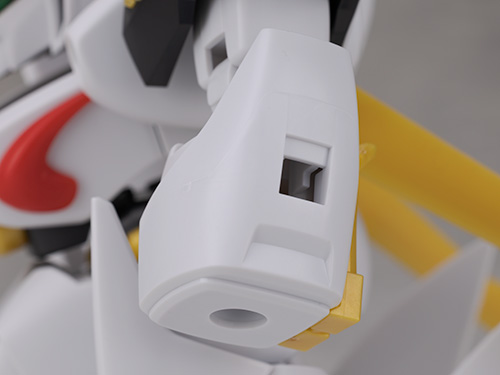 脚部アップ。白基調のスッキリしたカラーリングですが膝や脚の装甲の一部が開口されしっかり色分けされています。