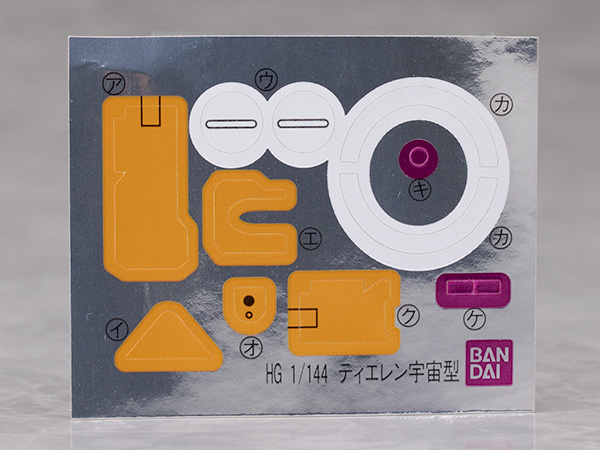 シール類はセンサー類の他、胸部のオレンジ部分と滑腔砲のホワイト部分を補うホイルシールが付属します。