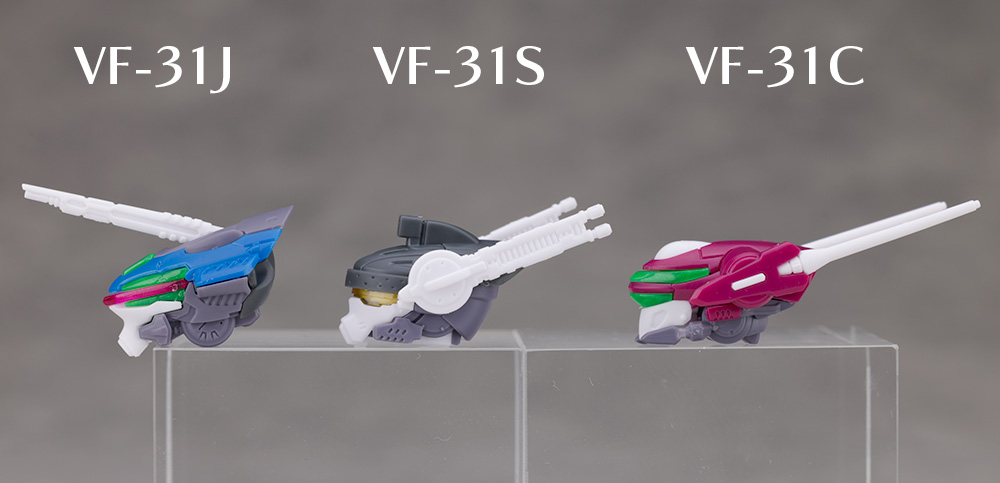 頭部アップ。VF-31J(ハヤテ機)やVF-31C(ミラージュ機)と比較しています。