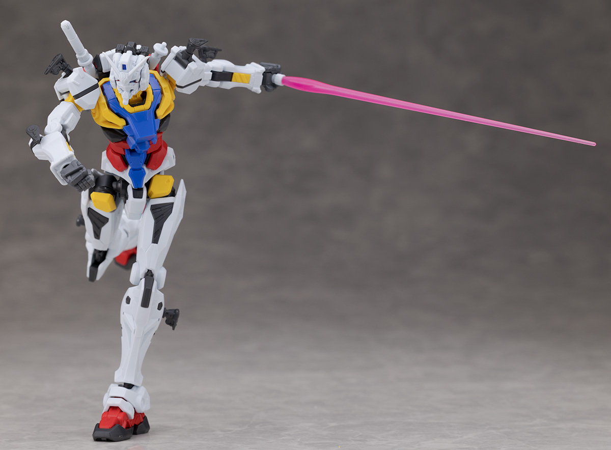 成型色や造形は赤いガンダムの物と変わらずスコープやフォアグリップが可動します。
