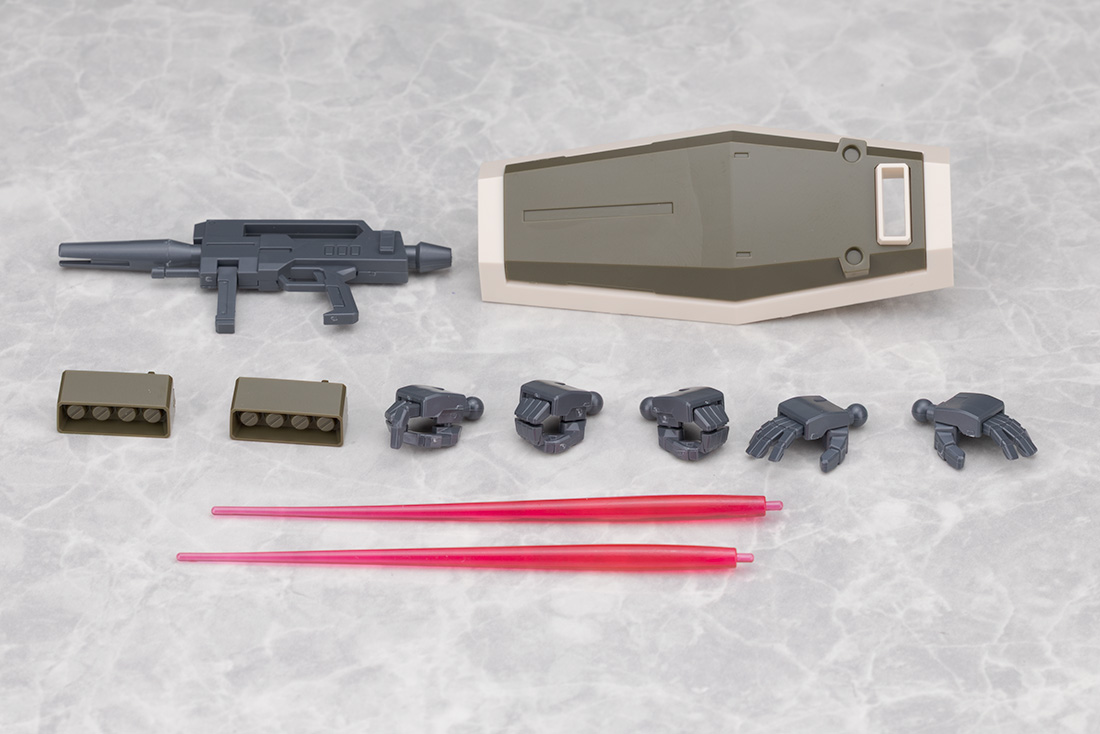付属品はビーム・ライフル、シールド、ミサイル・ポッド交換パーツ、右銃持ち手、持ち手、平手、サーベル刃2本が付属します。