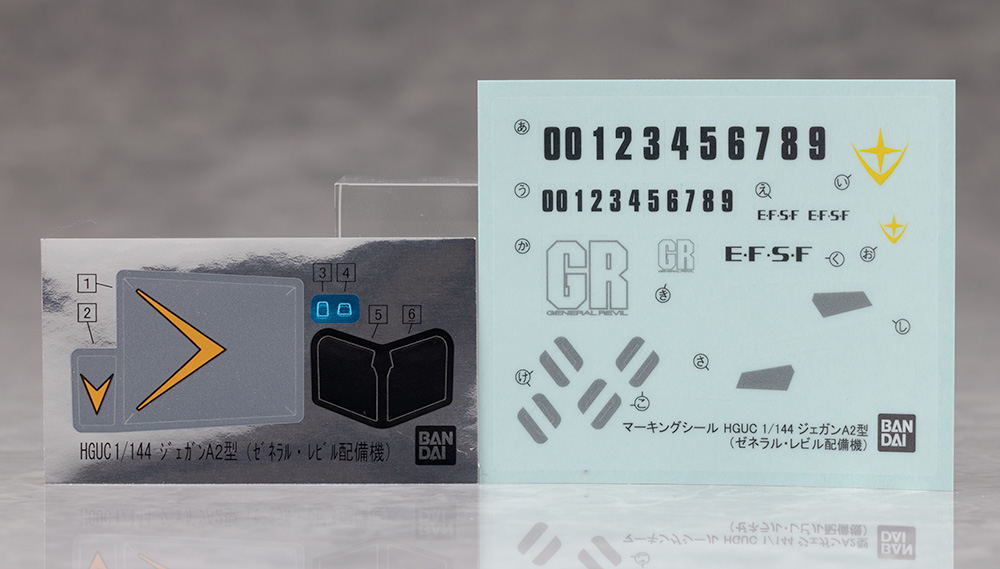 ゼネラル・レビルマークやナンバー、それにバックパックの出力口の色分けを補うマーキングシールが付属。