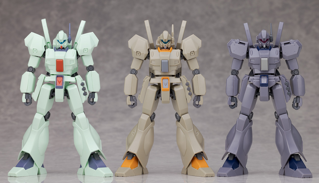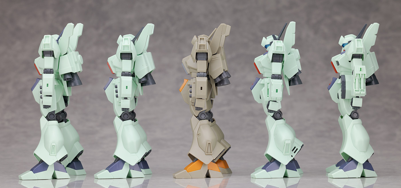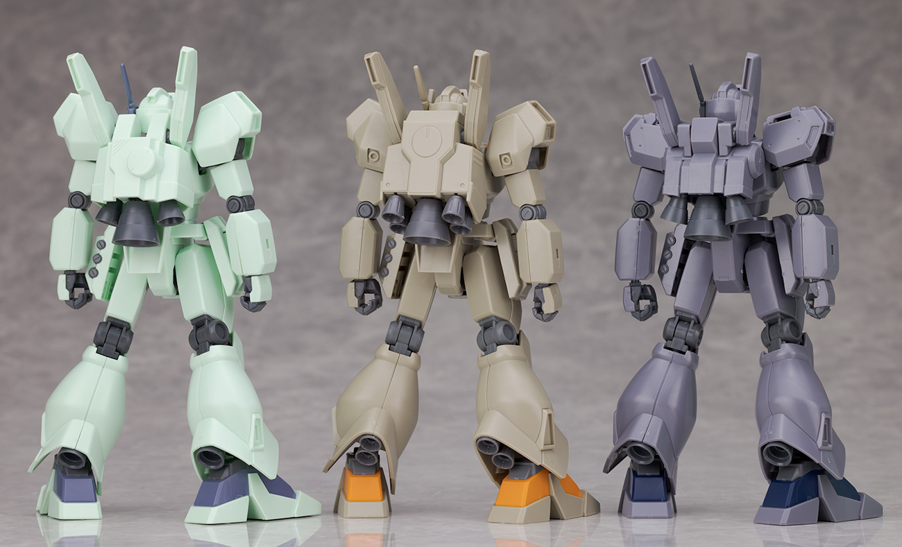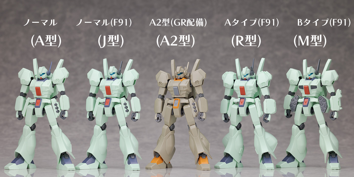 HGUC ジェガン(A型)やF91に登場するノーマルタイプ(J型)、Aタイプ(R型)、Bタイプ(M型)と比較。