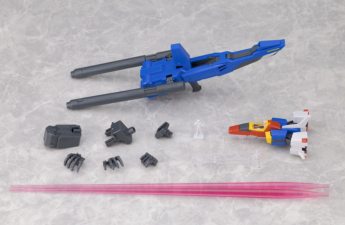 付属品はダブル・ビーム・ライフル、ダブル・ビーム・ライフル用右腕接続パーツ、スタンドジョイント、ジュドー・アーシタフィギュア、コア・ファイター、
