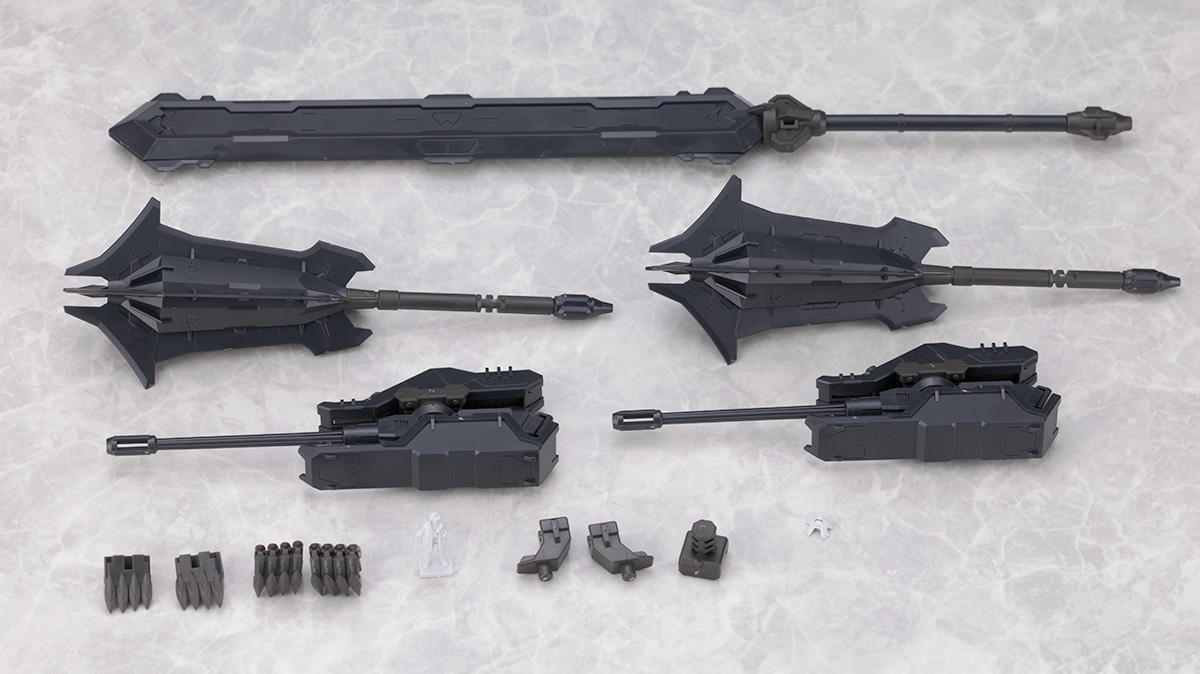 付属品はソードメイス、ツインメイス、腕部200mm砲、握り手パーツ、持ち手パーツ、武器マウントパーツ、スタンドジョイント、それに予備のマスクパーツが付属します。