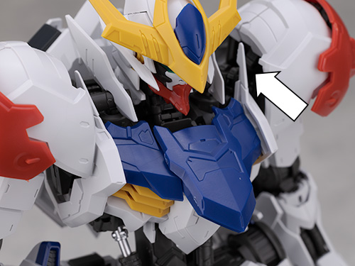 それと矢印部分にあるアンテナ状の突起は肩アーマーに干渉しやすいのでシャープ化したい人は注意が必要です。