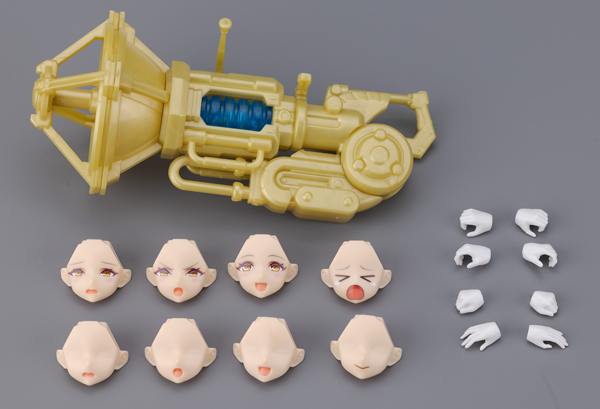 付属品はハーモニックウェポン(チューバタイプ)、交換フェイス3種+初回特典表情、デカール用フェイスパーツ4種、