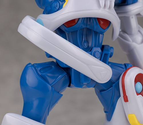 ただ完全に再現はされておらず、頭部側面や胸部装甲などの黒や肘周りの水色など細かい部分はデカールで補う方式です。