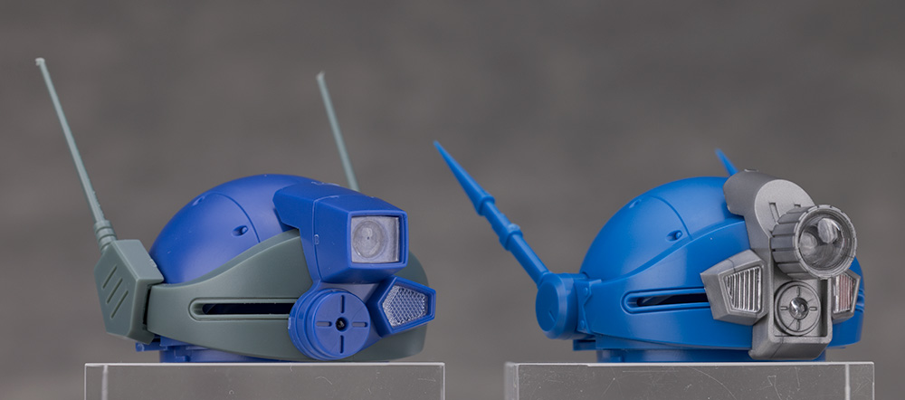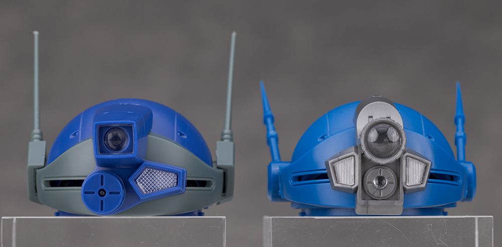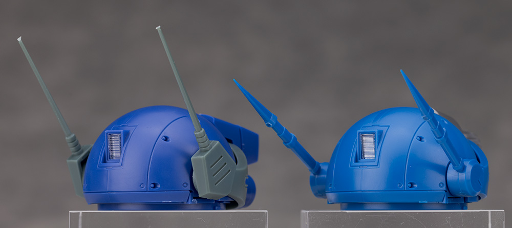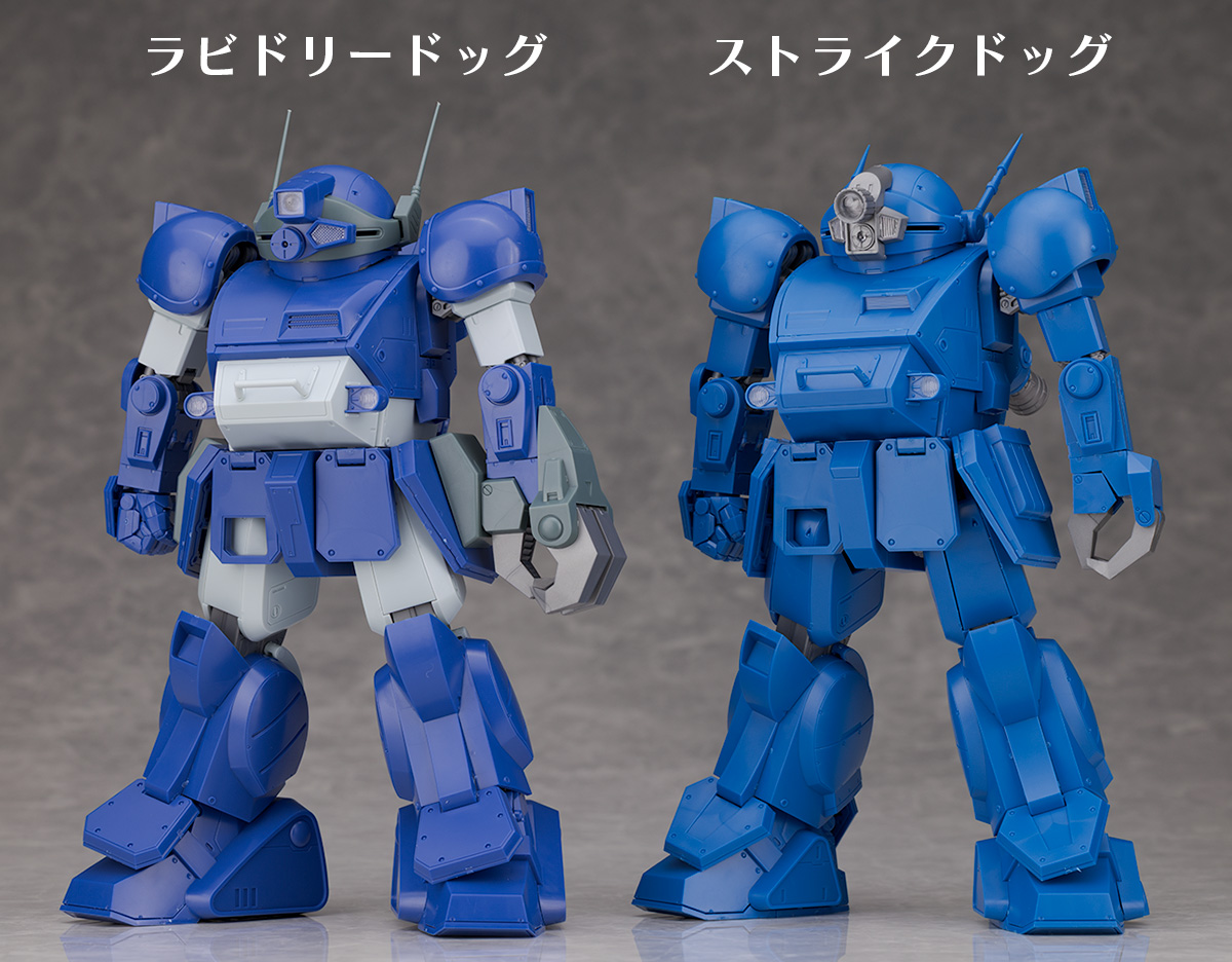 頭部はバイザーやアンテナの形状が大きく異なり、ラビドリードッグは角形で左右非対称のターレットレンズに変わっています。