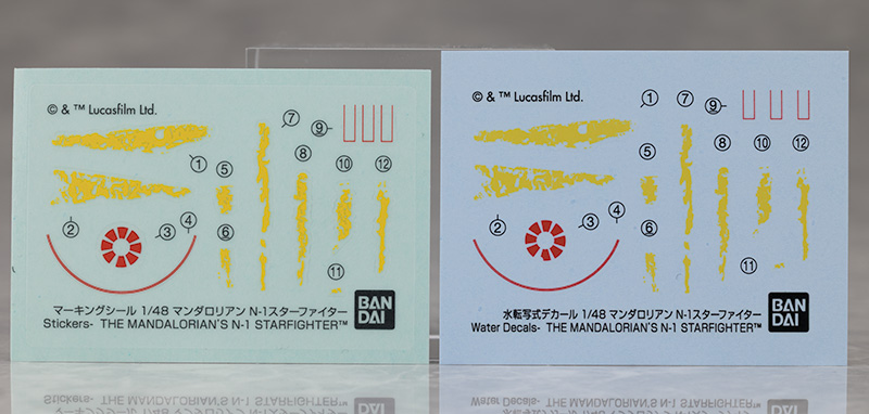 様々なカラーがあるN-1スターファイターですが、マンダロリアンのN-1スターファイターはほぼシルバー一色となっているためシールなども少なめ。